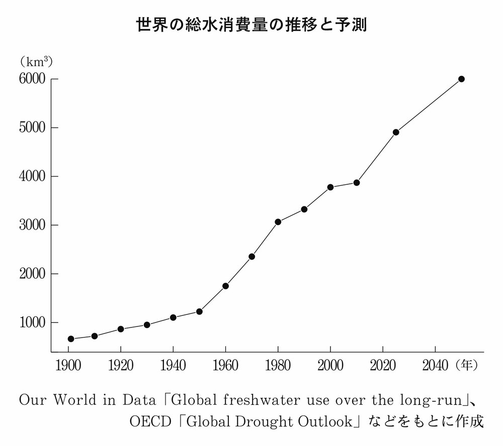 人間の水使用量は20世紀を通じて大きく増加しました。1930年代半ばに年間約1000立方キロメートルだった世界の水使用量は、2000年には約4000立方キロメートルに達しました。経済協力開発機構(OECD)は、2050年までに、この使用量が2000年比で55%増加するとの予測を出しています。水は循環する資源ですが、時間と場所によって、あるところでは余り、ないところでは深刻に不足します。水が足りない場所や時期は、これから増えると予測されており、2050年には、世界人口の40%以上にあたる39億人が、深刻な水ストレスに直面すると見込まれています。