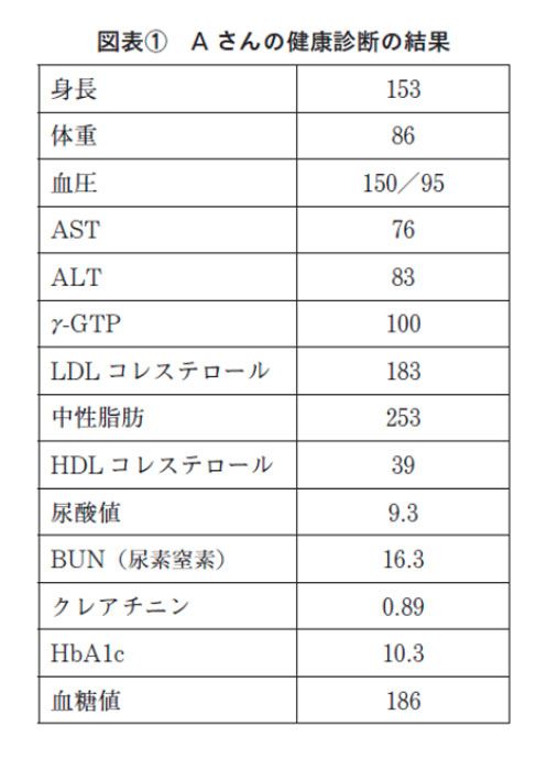 一言で言えば、かなり深刻な状態です。肥満、脂質異常症、慢性肝炎、高尿酸血症があります。そして重度の糖尿病も患っている。HbA1c(ヘモグロビン・エー・ワン・シー)は1~2カ月間の血糖値の平均を表し、6.5%以上の数値が出れば、糖尿病と診断される基準の一つとなります。Aさんの場合、それを遥かに超えた10.3%です。通常の2倍近くの血糖値が、ずっと続いていることを意味します。