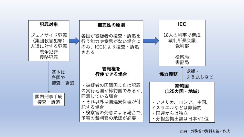 ICCは第二次世界大戦終結後のニュルンベルク裁判、東京裁判の系譜を継ぎ、1990年代に設置された旧ユーゴスラビア国際刑事法廷、ルワンダ国際刑事法廷など様々な積み重ねの上に2002年に設立された。戦争犯罪や人道に対する犯罪などを行った個人を処罰できる常設の国際刑事法廷としては世界初で、唯一の存在といえる。長引く冷戦期に幾度か阻まれたその構想は、冷戦の雪解けによって現在の形に結実した。
