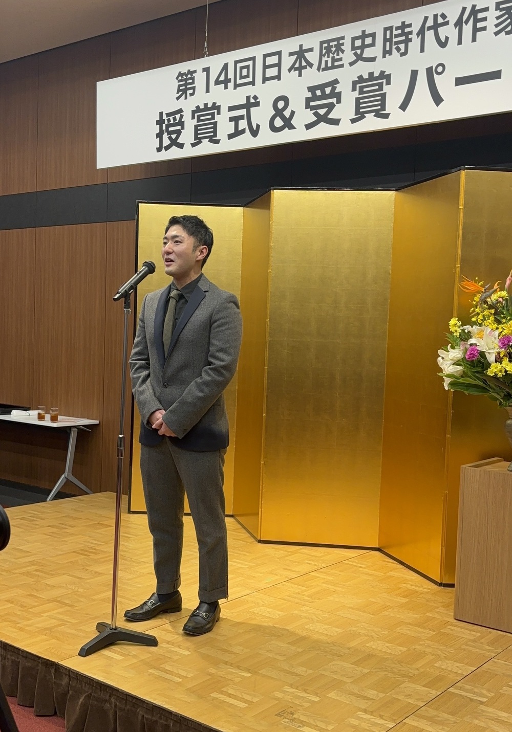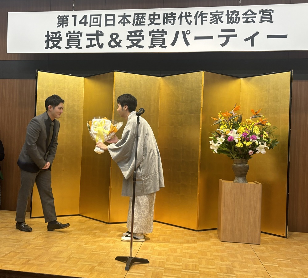 そんなデビュー作がこのたび、第14回日本歴史時代作家協会賞新人賞を受賞。先日行われた授賞式には、サプライズゲストとして歌舞伎役者の中村橋之助丈が登場し、米原さんへ花束とお祝いのスピーチを贈られました。