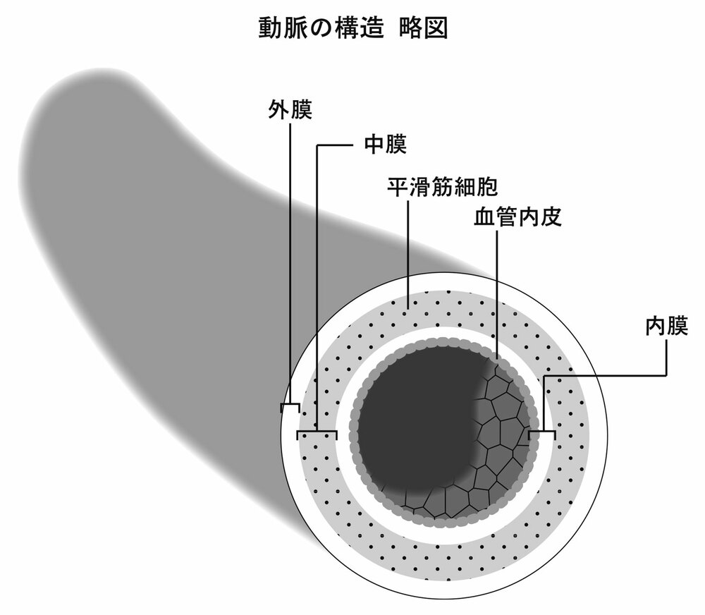 血管の壁は三層構造になっています。一番内側が内膜、真ん中が中膜、外側が外膜です。動脈硬化は、このうちの内膜から始まります。