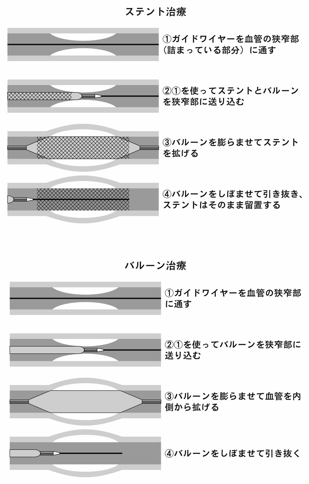 これらは一般的に「手術」と呼ばれ、健康保険の区分でも手術ですが、心臓の手術の場合でも、実際は手首の血管からカテーテル(医療用のやわらかい管)を冠動脈(王冠のように心臓に巻き付いて栄養を送る動脈)に入れて、そこを通じてステントやバルーンを入れる治療がほとんどで、胸をメスで切開する必要がないため術後の回復も早くなっています。これらの治療は外科でなく、循環器内科の先生が施術することが多いです。